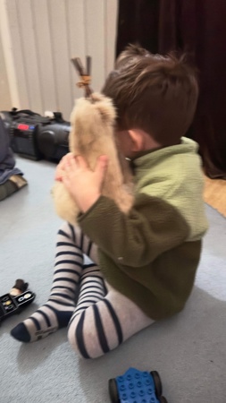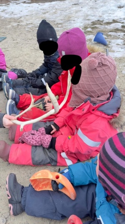 Etterpå fikk vi kjenne på et reinsdyrsgevir og da kjente barna med ansiktet, for det var litt kaldt og barna ville helst beholde vottene på.