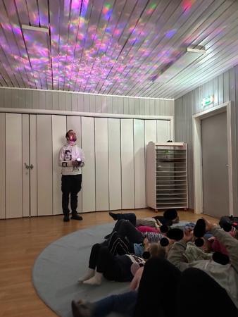 Etter at vi hadde lekt litt, var det til for å legge seg ned på teppe å slappe av. Vi lagde nordlys på tak i storesal og slappet av til joik. Mosebarna syns joik var kjempefint å høre på. De kunne ikke skjønner hvorfor samene ikke fikk lov å joike i gamledager, når det er så fint å høre på!