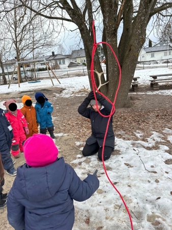 Etterpå skulle mosebarna prøve å fange reinsdyr. Det var først reinsdyret Matias de prøve å fange med lassoen, men det var ikke så lett. Alle prøvde flere ganger, men han kom seg unna hver gang. Etterpå var det Mirsada som fikk være reinsdyr, og hun var like vanskelig å fange. Til slutt satte vi geviret på en stol og de som ville øve mer fikk det.
