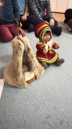 Etterpå pratet vi litt mer om det vi lærte i samling ute. Vi fikk også se og kjenne på en liten utgave av en lavvo og se en dukke med samekofte på.