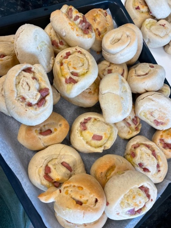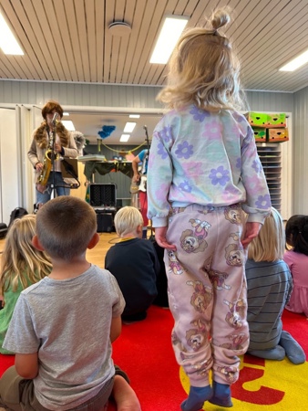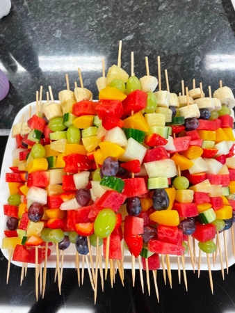 Når vi hadde fått rocka fra oss var det endelig tid for lunsj. Tone hadde bakt 140 pizzasnurrer og både store og små ble gode og mette. Til dessert var det fruktspyd. Nam!