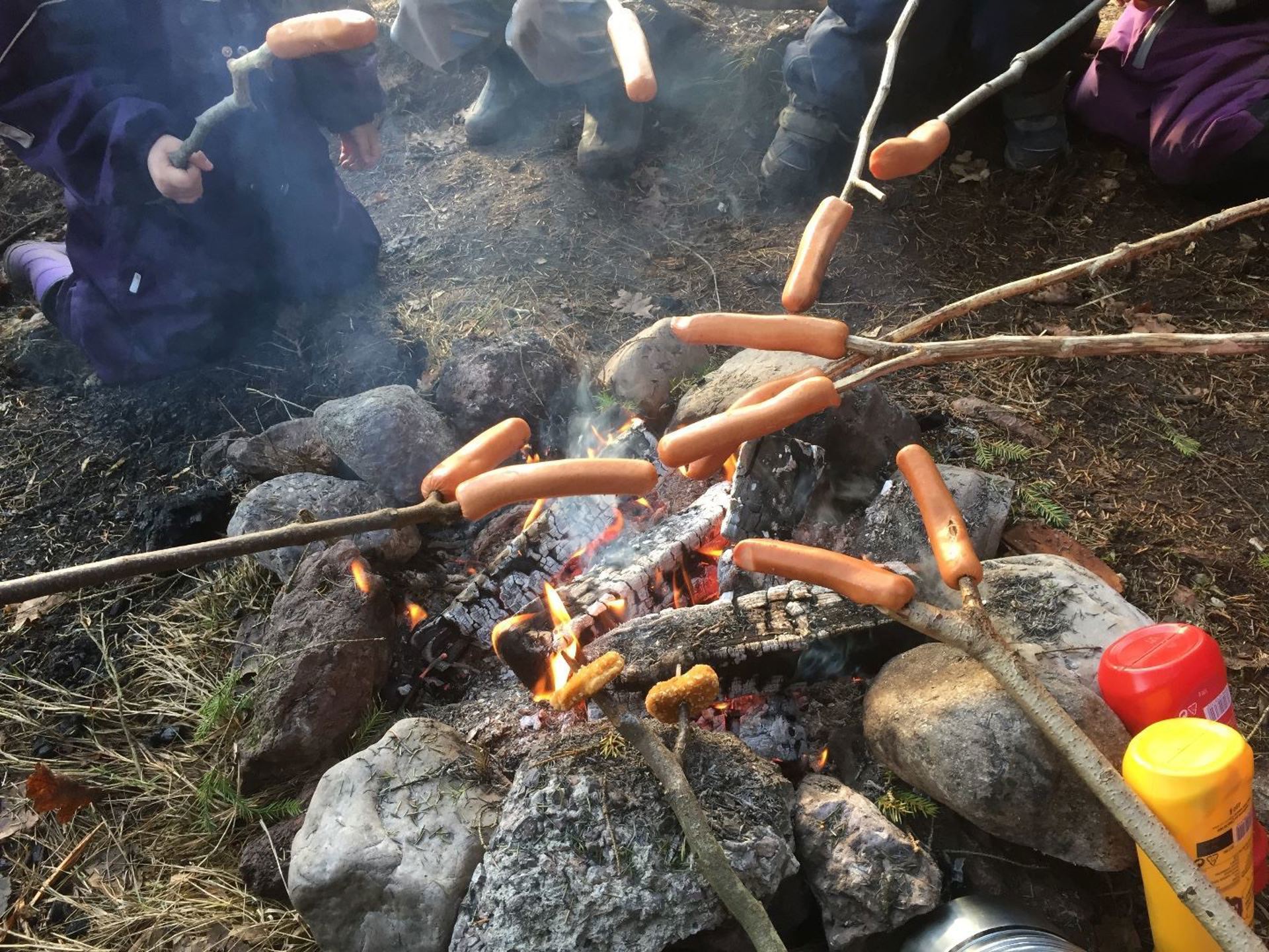 Mosebarna er veldig glade i å gå tur. Og ekstra stas blir det når vi har med oss pølser i sekken. Alle har laget sine egne pølse-steke-pinner. Pølsene smaker veldig godt når de er stekt på bål. Nam nam